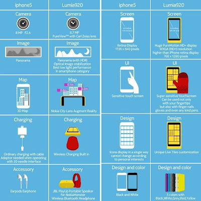 The smartphone advertisements battle between Apple, Samsung and the other smartphone enterprise now is getting worse. After previously appeared the advertisement about the advantages of Samsung Galaxy S III compared to iPhone 5, now turn to Nokia's claim that their new device is better than IPhone 5. They describe it in a picture displayed by the representatives of Nokia UK Facebook page. What are the differences? see the picture below.